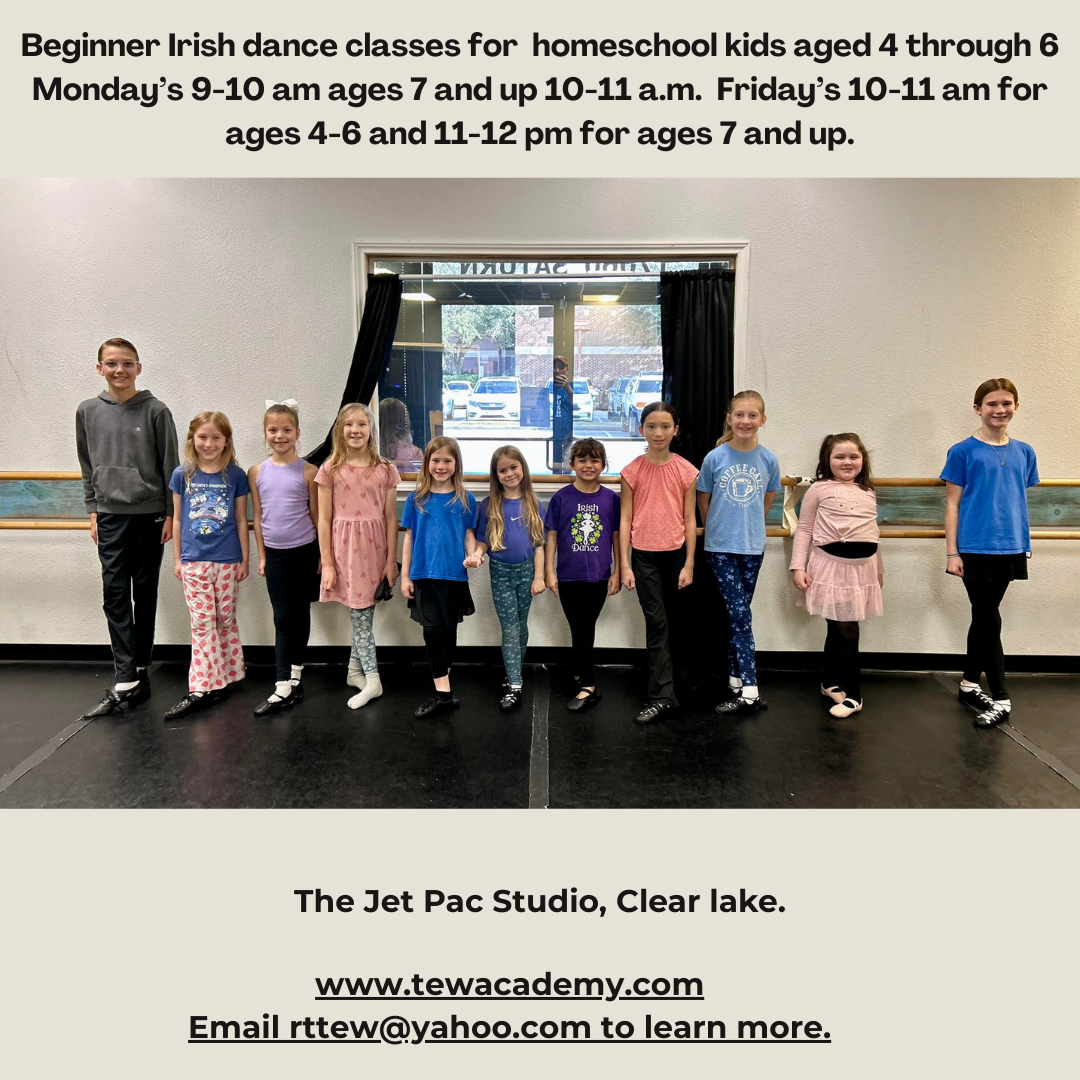 Come join us either Saturday’s 8-9 a.m. or Sunday’s 12-1 p.m. for beginner Irish dance classes in Clear Lake at The Jet Pac studio 17060 Saturn Ln.