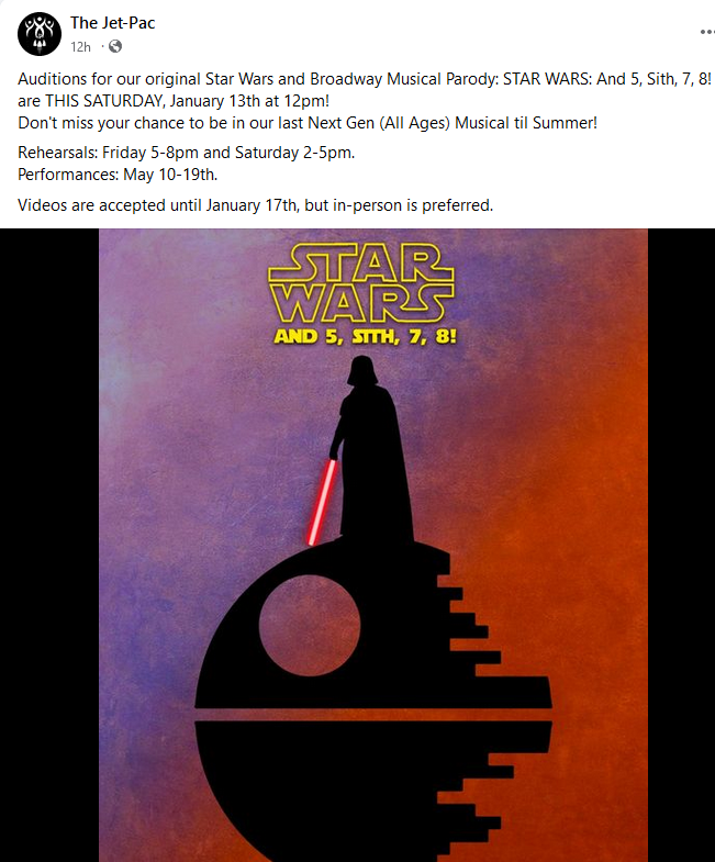 View this email in your browser August 2024 JET-STREAMHi JET-PAC Family! See below for our monthly updates!Upcoming PerformancesStaff SpotlightBirthdays…and more!As always, please direct any questions, concerns, or need for clarification to info@thejetpac.com!It’s Back to Class Time!We’re looking forward to seeing all of our students for the new season! Schedules have been posted to the parent portals! Classes begin Monday, August 19th!2024-25 Enrollment Form‘24-25’ Priority Season Ticket Packages NOW AVAILABLE!Please email melanie@thejetpac.com for more information on how you can take advantage of Priority Seating for the ENTIRE upcoming season!Limited quantities available!Student-Led Musical THIS WEEKEND ONLY!”The Guy Who Didn’t Like Musicals” is a horror comedy musical that playfully explores themes of individuality, friendship, and the world of musical theatre. The story follows Paul, an ordinary guy who despises musicals. However, he wakes up in a world where people spontaneously break into song and dance. As an extraterrestrial threat turns the town into mindless musical zombies, Paul and a small group of survivors fight to escape the musical apocalypse.Get your tickets! Auditions for “The Addams Family”Auditions will be held THIS Saturday, August 10 at 12:00pm..“The Addams Family” is a musical comedy based on Charles Addams’ ghoulish American family. The plot revolves around Wednesday Addams, who falls in love with a seemingly normal young man. As the two families come together for a dinner, secrets unravel, loyalties are tested, and hilarious chaos ensues. “The Addams Family” Audition Package Tick… Tick… Boom! Performances Tick…Tick…Boom! is coming to the JET-PAC in exactly two weeks! Our own Mr. Travis returns to the stage, along with Sarah Zuazua, Steven Reeder, and our first LIVE BAND! It’ll be a nonstop, rocking 90 minutes sure to launch us into next season with a bang. Don’t miss this incredible rock musical from the creator of RENT!Tickets: https://thejetpac.ticketleap.com/tick-tick-boom/ Choreography Mentorship ProgramAttention all aspiring emerging choreographers! We are excited to offer this Choreography Mentorship next season! Please reach out to heather@thejetpac.com if you would like to be considered. Volunteer Spotlight…Meet Kathryn “Kat” WrightKathryn Wright is another one of our most prized volunteers, and is our featured Spotlight for August! After growing up in Angleton as a dancer, going to college and raising a beautiful family with her husband Clay, Kat first heard of The JET-PAC through a mutual friend (and JET-PAC parent!) when she saw the Grande Jete’s B- Roll of The 25th Annual Putnam County Spelling Bee in the Spring of 2019! She immediately was intrigued, joined class the class the following Fall, joked that when a young Mr. Travis walked in in what she describes as pjs and sunglasses, that her first thoughts were “Who is this child leading our class?” (Ha ha!)! Kat says she really knew only one person at that point, and did not find out that their teacher was actually an adult until the next semester- right before they opened Detective Rob in the Spring of 2020! Currently, Kat is enrolled in the Adult Musical Theatre Class (Grand Jete’s), and Adult Tap. She lent a hand for the first time behind the scenes with costumes for the Grand Jete’s production of The Drowsy Chaperone and then assisted with sets in the Summer of 2021 for Don’t Dress For Dinner. She said she didn’t realize at first that is what she was in for, just that she randomly had to hold a nail gun for Travis in a rehearsal while he was building a window, and she ended up being asked to go screw something in that was loose- and the rest is HISTORY! Her favorite part of volunteering is the cooperation of ALL of the volunteers, seeing all of the pieces of what everyone takes part in all come together to make something cool, and seeing what it takes to support and make the shows come alive. Everyone is working together and doing a little, and in the end, it makes something GRAND! This is what also makes it hard sometimes… watching it all come down at the end of a production, and striking all of the sets, costumes, props, etc. that were all just perfectly placed together to make magic! Part of what she says is exciting is walking in the Black Box every week, and seeing that SOMETHING new has been created! Kathryn also shared that she thoroughly enjoys the time with the kids, seeing them grow and helping them be successful, talking through quick changes during rehearsal as a way to help them problem solve, and being present for any needs that may arise for all of the blooming artists that the studio is cultivating on a daily basis. In her early life, she originally was set to be a secondary English teacher… that is until she got to student teaching and just could NOT do it. This powerhouse says that stumbling upon a random B-Roll video of a local performing arts academy, finding that they offer adult classes, and taking the leap to join a class a half hour away from her house has been a blessing. Taking part in class and subsequently volunteering with costumes and set building has fulfilled the teaching heart that she still harbored deep down inside. Kathryn, we are so very lucky that you took that leap, and have found a home with us. Our young artists are better for having you, and your desire to always lend a hand when you see a need is, well, appreciated. We could not do so many things without you!So, if you see a tiny little strawberry blonde lady on a ladder, stuffed in the paint closet, or under a pile of costumes with her stitching gun, give her a high five- she TOTALLY deserves it! ![]() The JET-PAC 2024-2025 Season ProductionsWe are thrilled to offer another great season of productions! Please see the lineup of shows and performance dates below for the 2024-25 season:*Dates are subject to change. Any changes will be specif